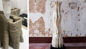 Mobiliario: La exposición SAMOROST utiliza sustratos de papel reciclado para crear piezas decorativas.